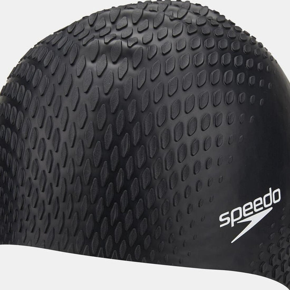 The Bubble Active+ cap features a zoned, bubble-textured design that allows for a smooth flow through the water.
