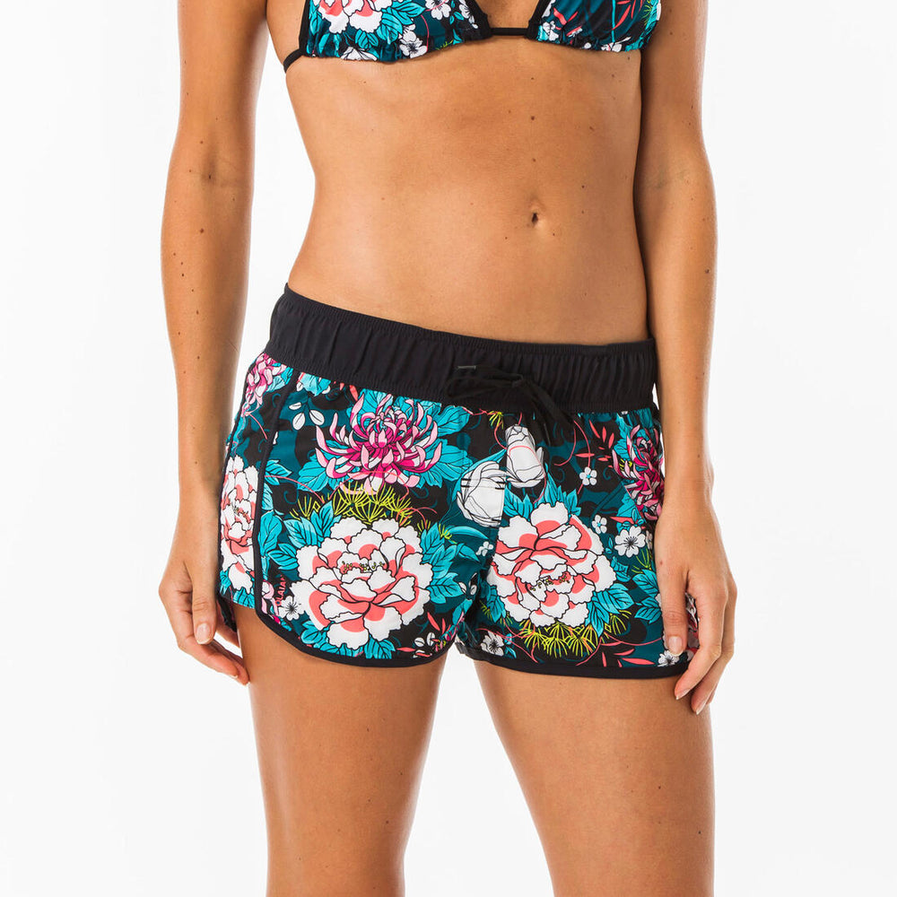 These short women's boardshorts are designed to be worn over your swimsuit for all water-based activities. They have an elastic waistband and drawstring.