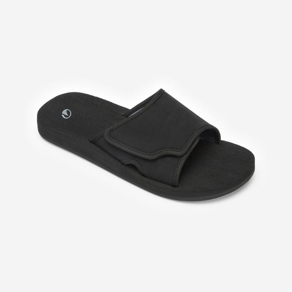 These slides are very comfortable, with an adjustable rip-tab upper that adapts to your foot and a sole that provides a good balance between cushioning and robustness.