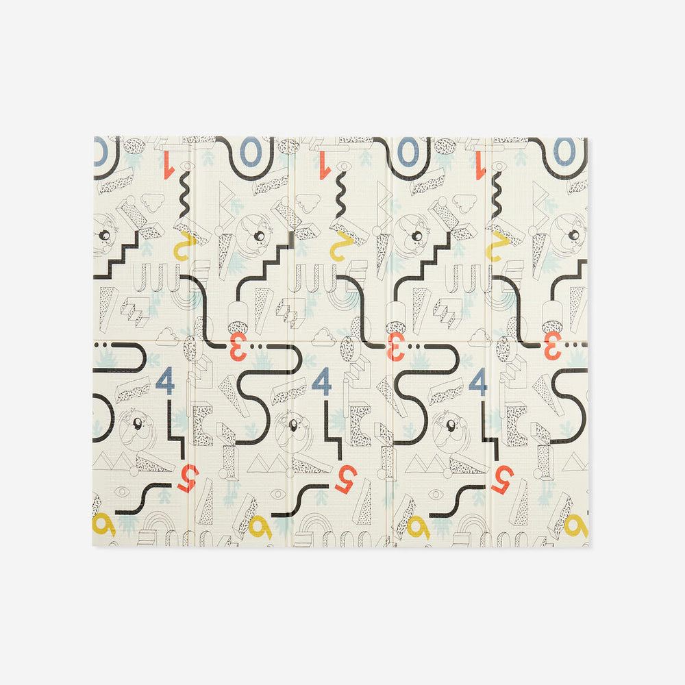 A collapsible stimulating mat. Folded side, patterns to stimulate your child. Exterior side, coordinates with living rooms that double as play rooms.